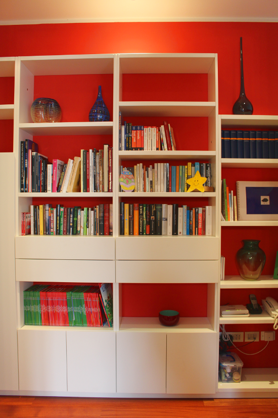 Tenuto conto di tutte le richieste, abbiamo scelto di realizzare la libreria in laccato bianco , senza schienali, in modo da far risaltare la parete rossa. Le ante e i cassetti sono privi di maniglie, hanno solo una gola con taglio a 45° lungo il bordo per permettere la presa.