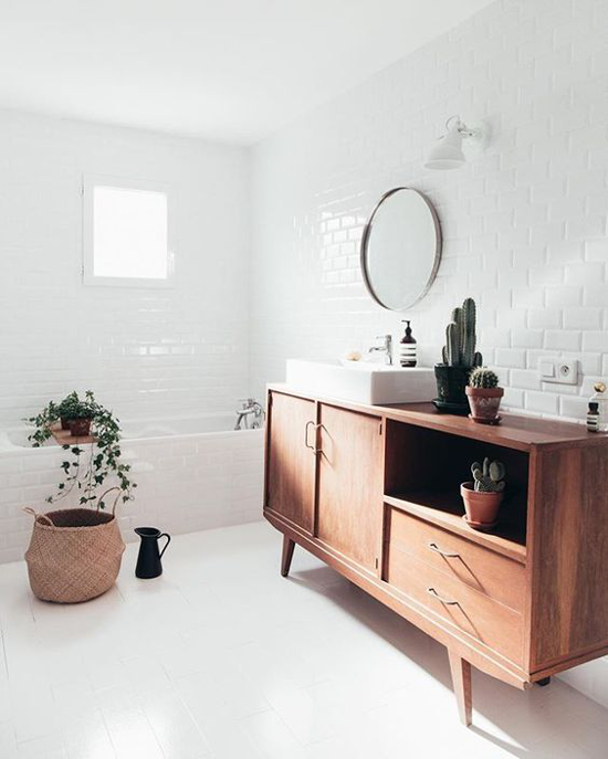 Un vecchio mobile da merceria come base di appoggio per due lavandini, in una composizione perfettamente simmetrica. Legno chiaro e total white per pareti, piastrelle e accessori rimandano ad un gusto nordico minimal e sofisticato.